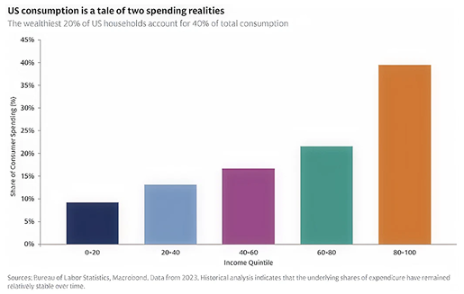 Consumers continued to spend, albeit more cautiously. Retail sales growth has slowed from the post-pandemic surge but has continued to grow at a steady pace, in line with the past few years. It’s worth noting that spending remains heavily dependent on the top 20% of consumers, who drive more than 40% of total consumption (chart from Goldman Sachs):