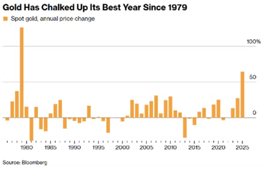 5. Gold delivered a historic performance. In 2025, gold surged 65%, its strongest calendar-year return since 1979. The move reflected a confluence of forces: heightened geopolitical uncertainty, sustained central bank purchases aimed at boosting reserves, and persistent investor concern around inflation dynamics (chart from Bloomberg):